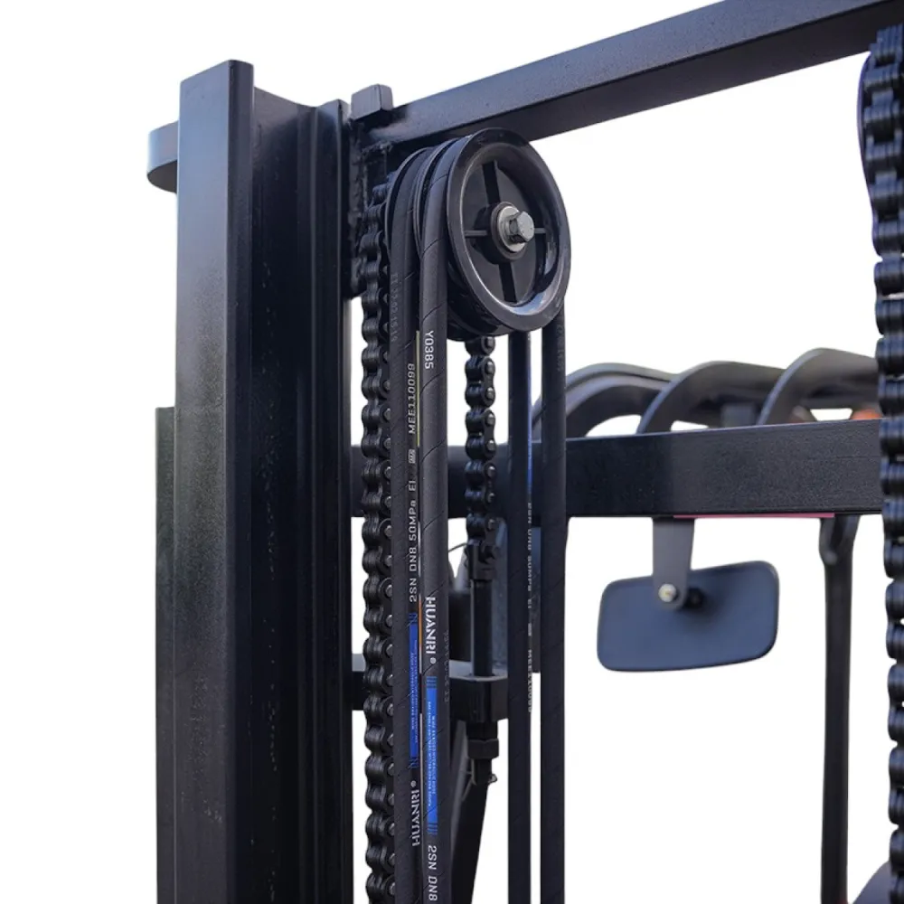 Прочные цельнолитые шины и четырёхколёсное исполнение обеспечивают устойчивость на разных поверхностях. Угол наклона мачты (5° вперёд и 10° назад) упрощает работу с грузами, а поперечная регулировка вил от 100 до 1040 мм делает технику универсальной для разных типов паллет.