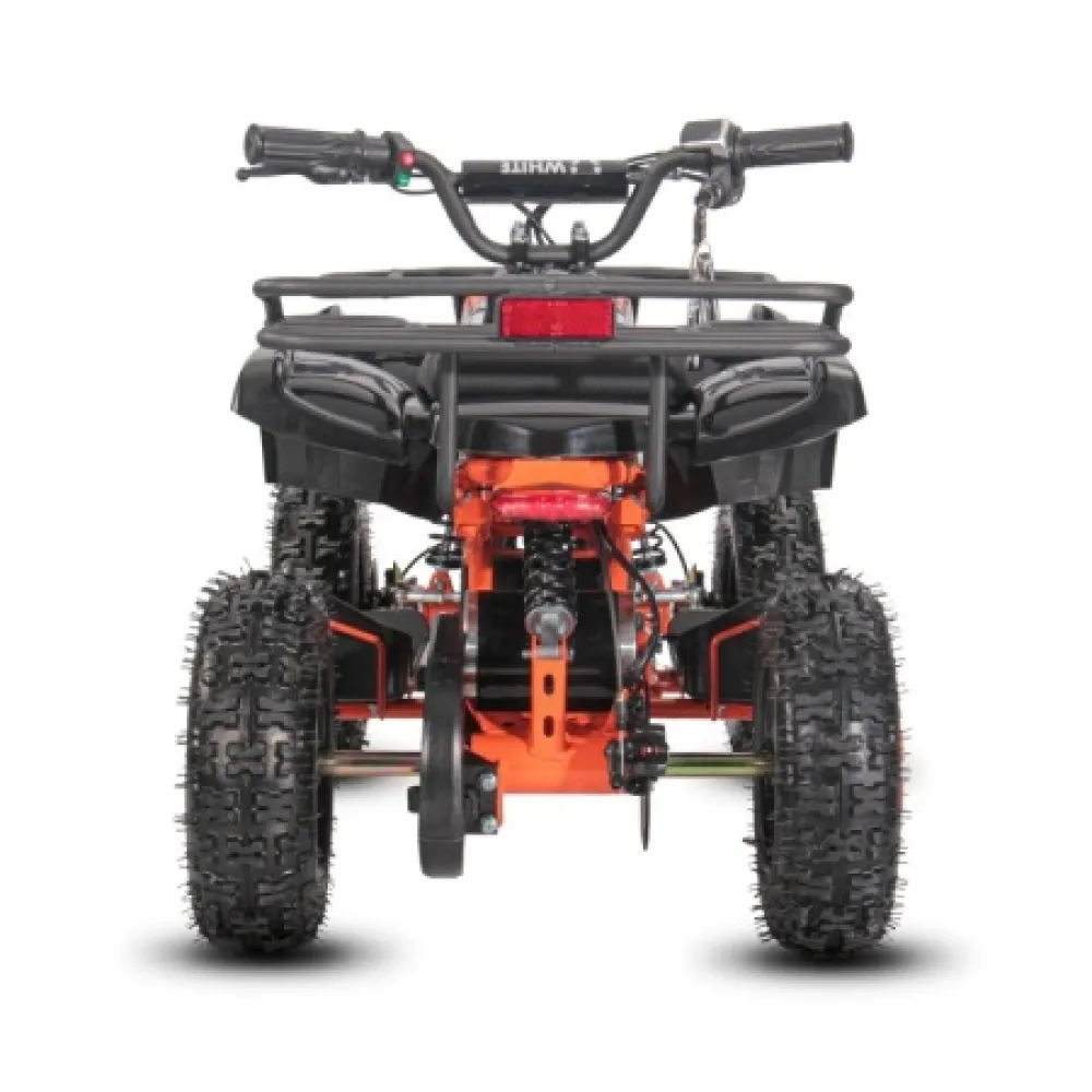 Запаса заряда АКБ хвати на преодоление 25 км пути без подзарядки. Фирменные амортизаторы обеспечивают плавную езду по любому типу дорожного рельефа. Электроквадроцикл оснащен большой светодиодной фарой, разрешающей езду и развлечение подрастающего водителя в вечернее время и непогоду.