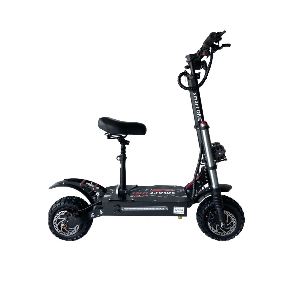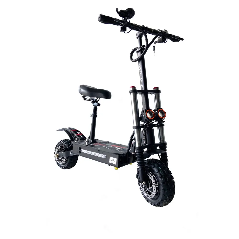 Модель оснащена 2 мотор-колесами, мощностью каждого по 1200 Вт. В сочетании с емкой батареей техника способна развивать скорость машины – до 90 км/час и преодолевать 70 км пути. Время работы тс на одной подзарядке достигает 10 часов. Полноприводный электросамокат оснащен удобным седлом широкой декой, которые при путешествии на дальние расстояния увеличивают степень комфорта ездока, минимизируют ощущение усталости.