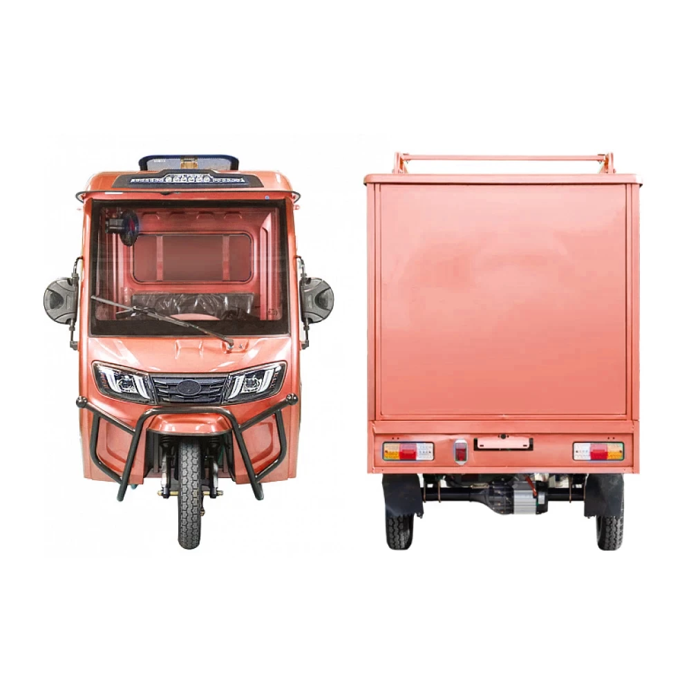 Грузовой электротрицикл Rutrike КАРГО Кабина Дуал красного цвета - это инновационное транспортное средство, которое сочетает в себе эффективность, экологичность и функциональность. Сконструированный для перевозки грузов, этот электротрицикл обладает высокой проходимостью и надежностью.