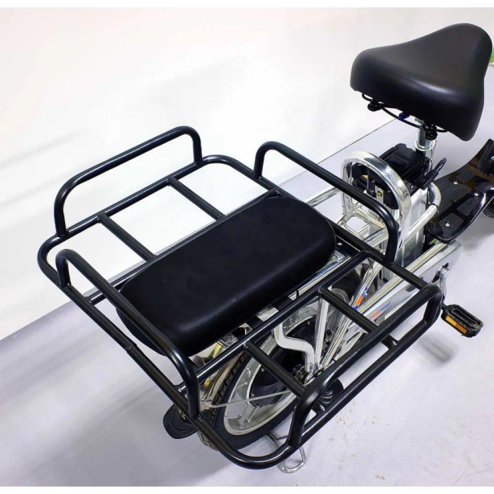 Техника имеет мощность – 350 Вт, надежную тормозную систему, не требующую применения силы. Качественный АКБ позволяет разгоняться до 35км/час и ехать на одной подзарядке до 40км. На этапе производства электровелосипеда производители позаботился об удобном мягком сидение, снижающим нагрузку на позвоночник, снимающим усталость со спины.