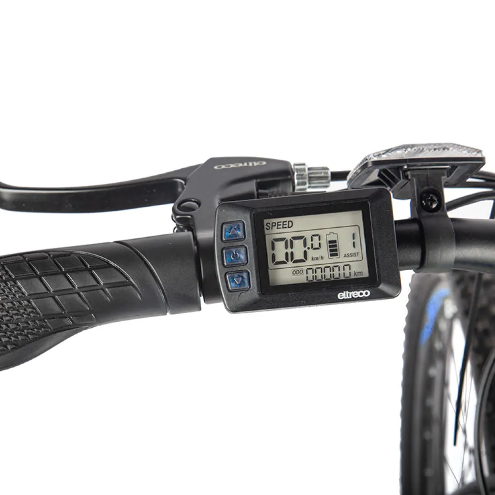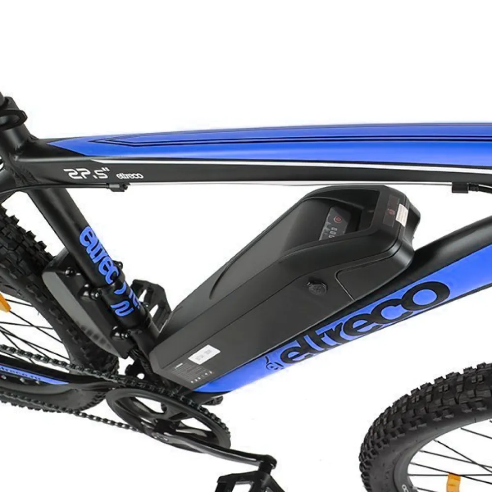Велогибрид Eltreco XT 600 – доступная и востребованная на рынке электровелосипедов модель. В сравнении с предыдущими вариантами имеет облегченную алюминиевую раму, сглаженную геометрию, в которой нельзя найти острых углов. черно-синяя модель велосипеда сочетает в себе роскошь и многофункционал. Общий вес велика – 20 кг. При разработке модели производитель использовал оригинальные брендовые запчасти, что сделало срок службы техники длительным. Технические особенности электровелосипеда следующие: